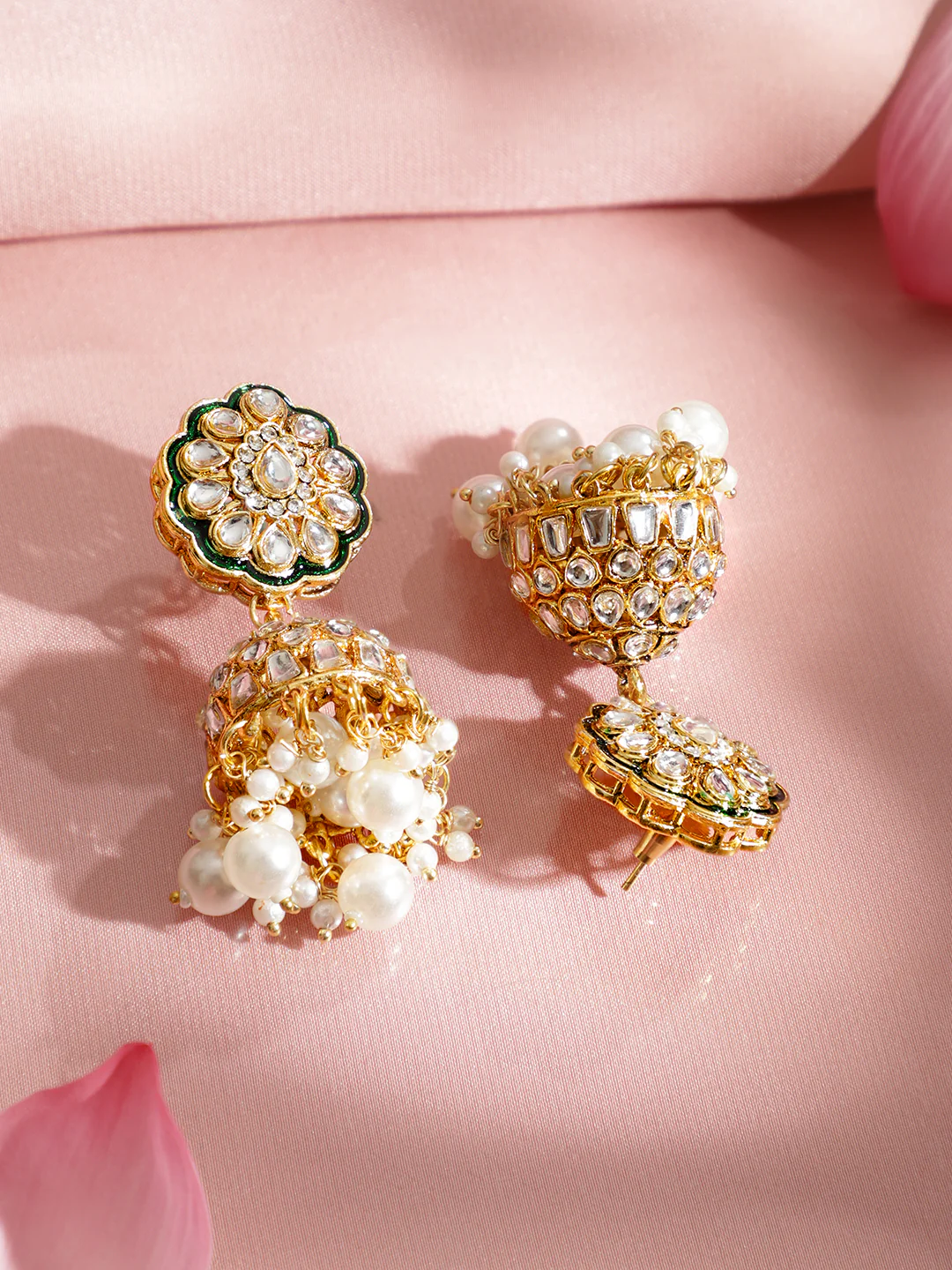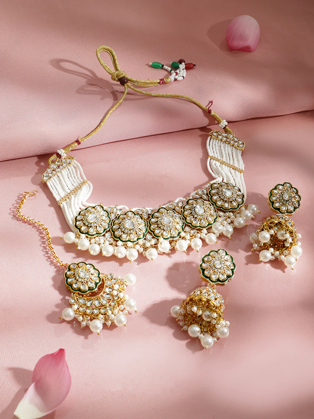 Add a touch of refined elegance to your traditional wardrobe with our 22K Gold-Plated Brass White Kundan, Cubic Zirconia & Pearl Beaded Floral Choker Necklace Set. Beautifully crafted with sparkling CZ stones, premium white Kundan, and glossy pearl beads, this floral-themed choker delivers a perfect blend of heritage and sophistication. Ideal for weddings, festivities, and cultural events, it pairs wonderfully with sarees, lehengas, and other ethnic outfits.