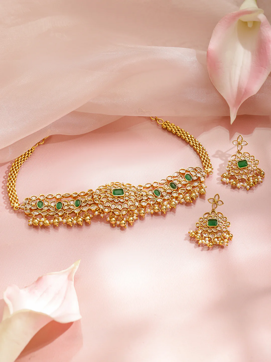 Enhance your traditional wardrobe with the 22K Gold-Plated Green Kundan & White Cubic Zirconia Choker Set with Pearl Beads. Designed with premium green Kundan stones, brilliant CZ accents, and delicately strung pearl beads, this choker blends charm, sophistication, and heritage perfectly. Ideal for weddings, sangeet nights, festivals, and special celebrations, it pairs beautifully with sarees, lehengas, and anarkalis.